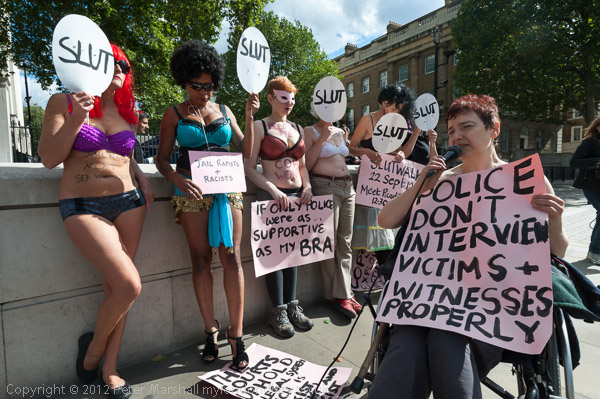 Fifteen or so women, including rape victims, sex workers, a disablement activist in a wheelchair and a pensioner, stripped to their underwear for the protest, holding up placards with the word SLUT and posters against the current failure by the law, police and courts to treat rape seriously. Most too had slogans painted on their bodies, and they sang and chanted and spoke in protest.