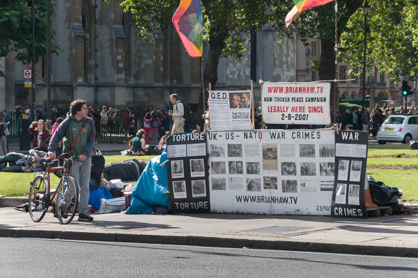 This afternoon there were half a dozen protesters on site continuing the Parliament Square Peace Campaign protest. A large poster on the pavement points out that Article 20 of the UN Declaration of Human Rights states "Everyone has the right to freedom of peaceful assembly and association." and comments "but not at the centre of DEMOCRACY where even seeking shelter is against the law."