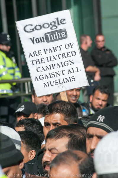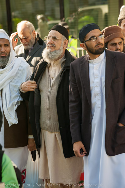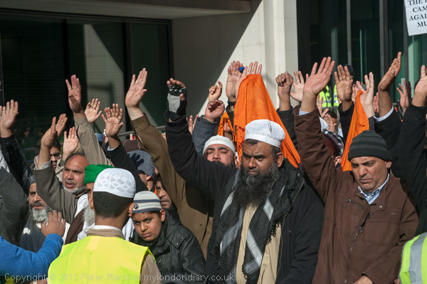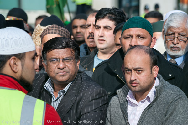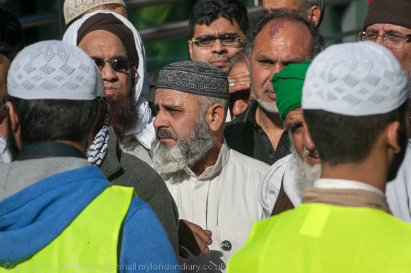 At first the protest was in one carriageway only and a large pen was filled with Muslim men, with speakers and screen at the far end