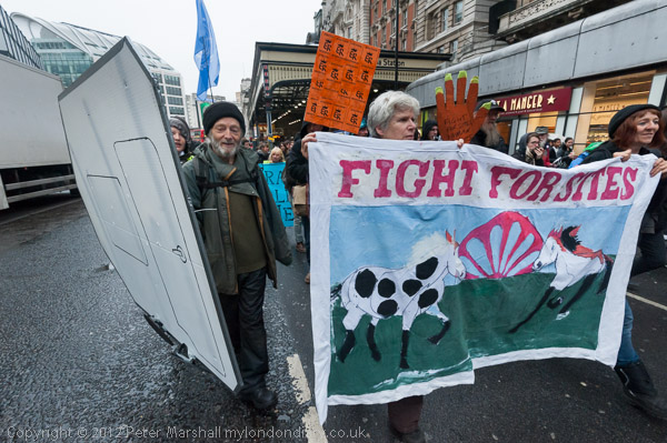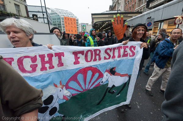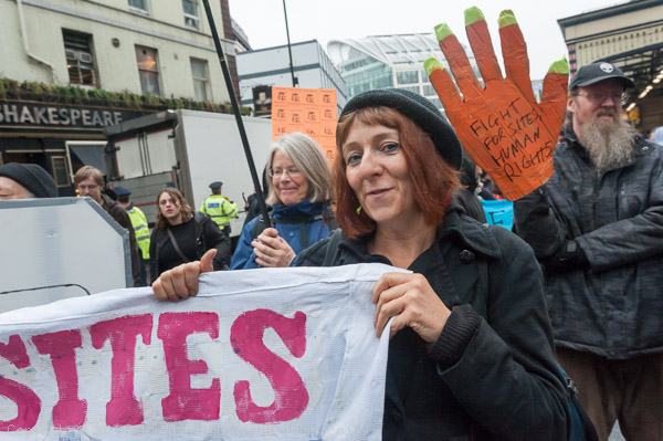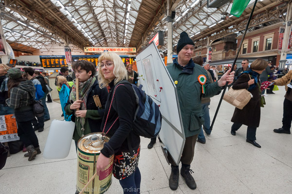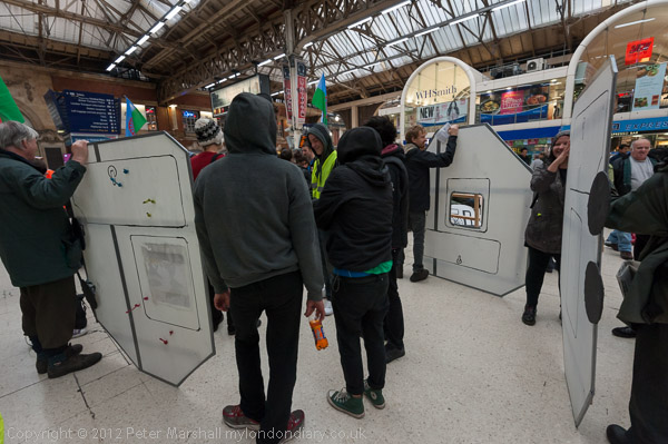 In Victoria Station: Board panels were painted as caravan sides to carry in the protest