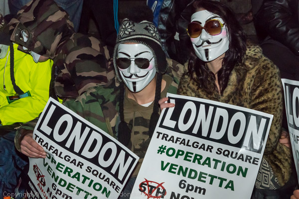 Anonymous, a worldwide Internet-linked loose grouping of people concerned with freedom and social justice have adopted the Guy Fawkes mask popularised in the graphic novel and film 'V fo Vendetta' as their trademark, the mask symbolising the anonymous nature of their protests and its multiplicity their organisation without a leader. November 5th, Bonfire Night, was thus a obvious date for what was meant to be "a worldwide Anonymous operation of global strength and solidarity, a warning to all governments worldwide that if they keep trying to censor, cut, imprison, or silence the free world or the free internet they will not be our governments for much longer." As their press release goes on to say, their message was "Change is coming."