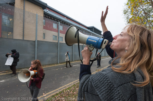 The centres are surrounded by tall fences which make it hard to see inside, topped with rolls of razor wire, but even so the protesters could see some of the detainees inside waving to them and waving back. As the protesters outside chanted 'Freedom' and other slogans, and used the megaphone and a poster to tell the detainees their phone number, we became aware of an increasing noise from inside the prison, with the detainees banging on windows and walls and shouting back to those outside. A message of support from the women detainees in Yarls Wood detention centre was read out, and then the protesters returned to opposite the blocks where they had seen most support, and moved up onto a grassy bank opposite so they could be more easily seen from inside the fence.