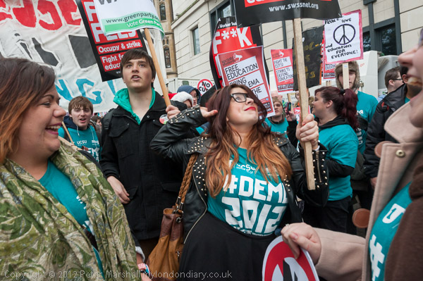 Approaching 10,000 students gathered for a peaceful march through central London today against government policies and actions that have hit students, women and the disabled particularly hard. They are angry about the tuition fees increase, with most university courses now costing £9,000 per year from this academic year, over two and a half times the maximum fee for the previous year of £3,375. The average student starting a course today is expected to end up with over £50,000 of debt for their three year course. Living costs have also risen because of inflation, and many find the maintenance loan available isn't enough to pay for their accomodation and some need to take out more expensive loans than the student loan to keep alive during their course. Younger students, 16-18 year olds still in schools, sixth form colleges and FE, are angry at the loss of the Educational Maintenance Allowance (EMA) of up to £30 per week, which many needed to pay their fares to college and to buy midday meals while studying.