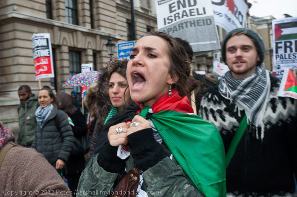 Several thousands turned up at Downing St in persistent rain to protest noisily against the recent Israeli attacks on Gaza and the continuing blockade which makes normal life impossible there. Although Israel claims its attacks are a retaliation for Palestinian rocket attacks on Isreal, the death toll shows the response to be totally disproportionate, with 163 Palestinians and six Israelis being killed before the ceasefire on Thursday.