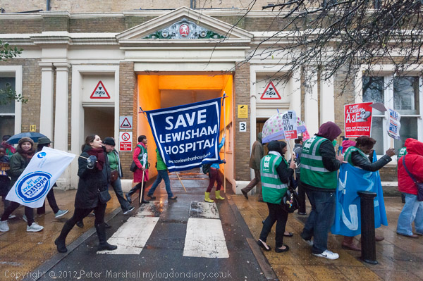 The Save Lewisham Hospital campaign made it very clear that they didn't want their protest to interfere with the normal working of the hospital, and ensured that the entrances and exits for ambulances were kept clear. But the number of people still flooding in after the hospital had been encircled meant that traffic on the High Street was brought to a standstill and nothing was moving along there or Ladywell Road when I caught a train from Ladywell.