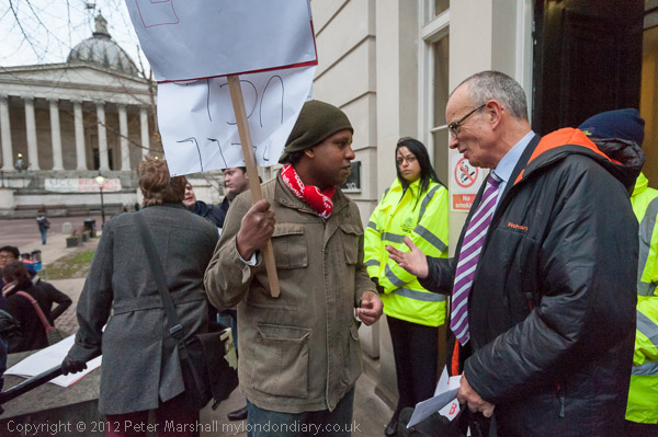 Around a hundred people attended the protest in the main Quad at UCL, including leading members of CARP and students and staff of UCL. After a few short speeches, the protesters moved to picket the main entrance to the building where the UCL council meeting had been rescheduled. CARP members were able to talk to a couple of members of the council on their way to the meeting, and also to some other members of the academic staff. One of the council members said that the university did not yet have fully developed plans and that there would be consultation with the residents before any development took place.