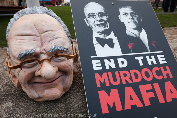 placards 'End the Murdoch Mafia' and a flaming dustbin into which Murdoch