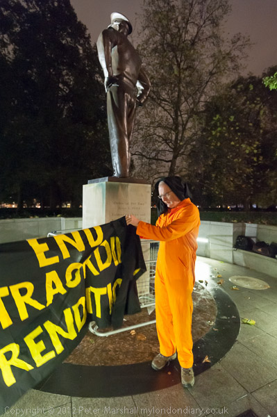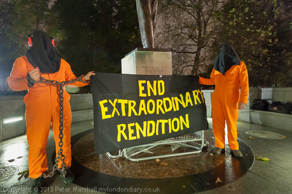 'End Extraordinary Rendition' banner with men in orange suits and black hoods, one in chains under the statue of Eisenhower