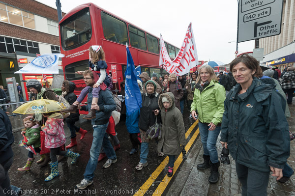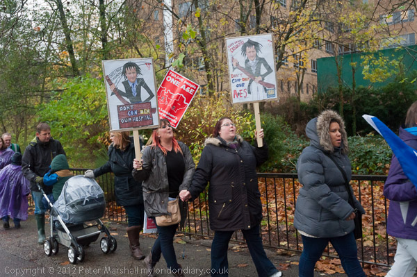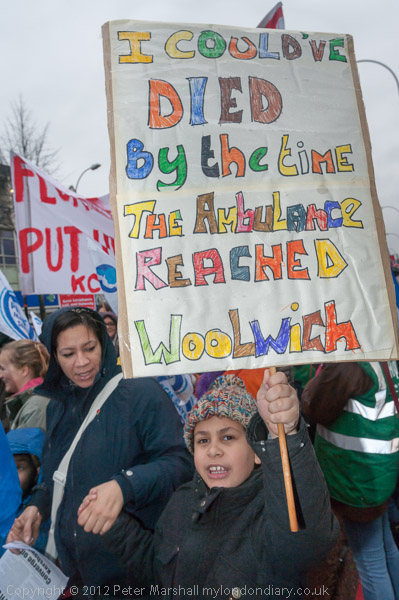 A young protester with a banner 'I Could've Died by the time the Ambulance reachede Woolwich'