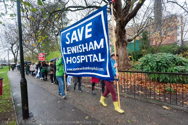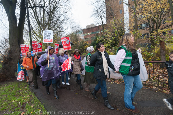 Hospital staff lead the way as protesters start to form a human chain around the extensive hospital site