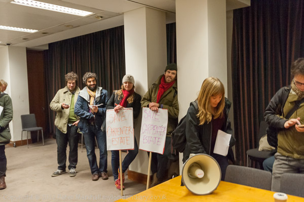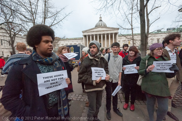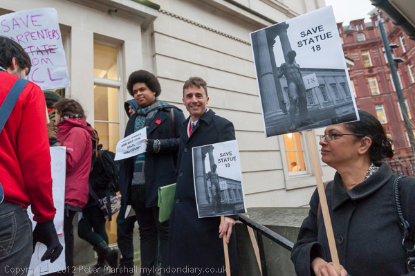 Protesters walk into the building past the dressed skeleton of Jeremy Bentham