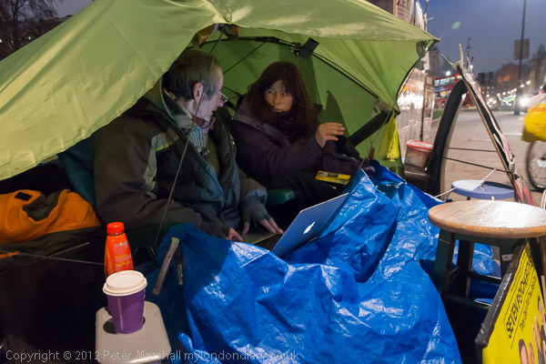 I visited the peace campaign briefly while Barbara Tucker who looked and sounded well was working on an urgent deadline for an article about the peace campaign with one of her supporters. They were sitting under a large umbrella with blankets and many layers of clothing writing on a Mac. Even the umbrella has been taken away from them on various occasions, but has been returned. It was dark and just a degree or two above freezing.