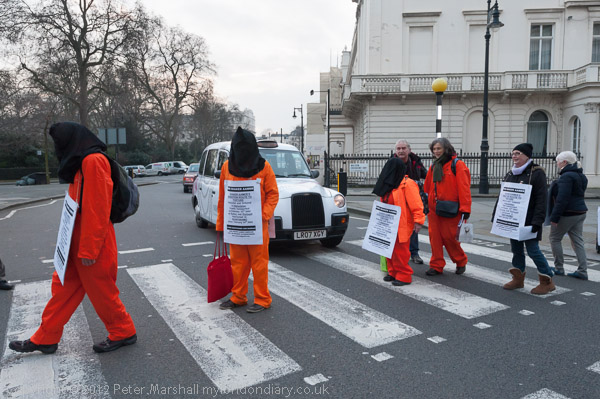 On the 11th anniversary of the illegal US prison camp at Guantanamo bay, four walks in London mirrored the route taken by detainees including Shaker Aamer, calling in turn at the embassies of countries who colluded in his illegal rendition.