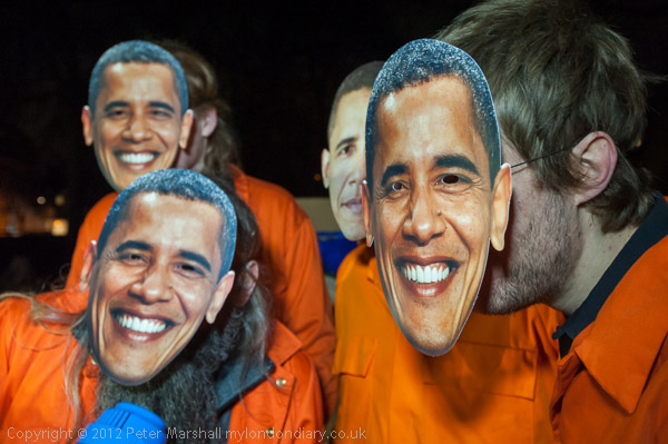 Protesters, some wearing orange jumpsuits, came to the US embassy in the early evening for a candle-lit vigil. There were a number with 'Obama' face masks as well as one or two wearing the masks of detainees.