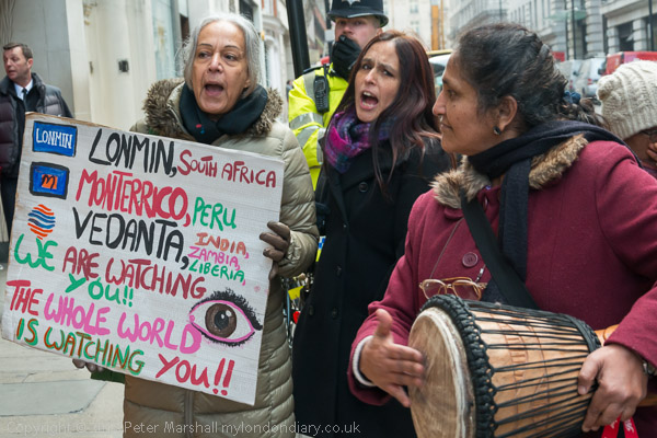 The protest outside Vedanta's London office took place on the street outside the building where they occupy a suite on an upper floor, and was a noisy but peaceful affair with a large number of banners and placards listing some of Vedanta's crimes around the world. It started with a group of around a dozen but soon grew to around 50, including Japanese anti-nuclear protesters as Vedanta is also involved with nuclear power in India.