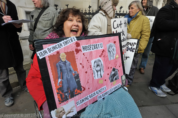 The protesters included a number of disabled people, with a few in wheelchairs, but more who have mental health conditions, along with a number of pensioners, trade unionists from the court branch of the PCS and other supporters. They stood outside the court with placards and banners and held a rally at which many of those present spoke. The speakers reminded us of the special problems with the Work Capability Assessments (WCAs) for many with mental health conditions, as these are often spasmodic, which may result in claimants on a good day not seeming very ill and on a bad day being unable to attend an assessment - which results in them being automatically judged fit for work. They stressed that few of those carrying out the tests had sufficient knowledge and experience in the area of mental health to be able to sensibly conduct the assessment, and called for medical records to always be presented and used in the assessments.
