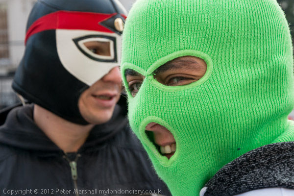 After a few minutes, police persuaded and guided those protesting against the right wingers to move back towards the main body of the protest, and they slowly did so. After the 'English Loyalists' had been in the pen for just over 20 minutes, police had a brief word with them and then escorted them away and to the nearby tube station, followed by a slightly larger crowd still shouting insults. A few snowballs were thrown at them, but I saw no real incidents, although there was a little of a scuffle as police stopped protesters following them onto the tube.