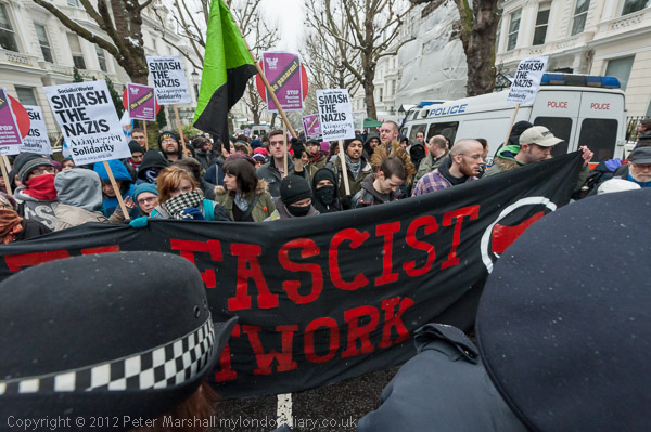 Around five hundred people gathered outside the Greek Embassy in Holland Park to protest against the fascist Golden Dawn Party in Greece and its attacks on immigrants and others there as part of an international day of action. There was a small counter-protest with 15 people organised by the 'British Friends Of Golden Dawn'.