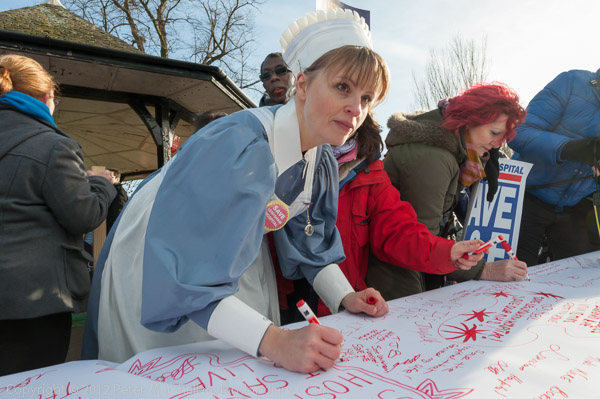 The protest was clearly larger than the earlier march to save the hospital in November, and there were more obvious supporters among community organisations, including Millwall FC, who had retimed Saturday's match to Friday evening so they could take part in the event - and the players wore the campaign t-shirts. At least one other of south London's league teams was also giving its support, as well as many other organisations in South London. Many of the placards were interactive, with a space where those carrying them could add the name of their organisation - and many had done so. Several bands took part in the march, including one that had been a part of the Olympic opening ceremony, marching with light-bulbs in their hats. As was pointed out before they came on stage at the rally, that performance had very much lauded the NHS as one of our great national strengths, so it was appropriate that they should be taking part in a march aimed at protecting it. The fight to save Lewisham Hospital isn't just a local issue, but very much a national one, with the provision of medical services that form the bedrock of the NHS under attack. If the government can close down services at Lewisham, no other successful hospital in the UK is safe in their hands.