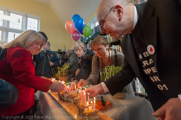 Alex Benyehuda read a poem about the need for libraries, which included some telling questions about whether you would snatch books away from people, particularly children; Phoenix talked about the need to make empty properties available for the homeless as well as the campaign to save libraries, the barrister who had represented the protesters spoke, and the many candles on the impressive 'bookworm' cake were lit before the legal adviser to the campaign cut it and then blew them all out. There were a lot of candles on the cake, I think one for each day of the occupation by the Occupy squatting activists that saved the library.
