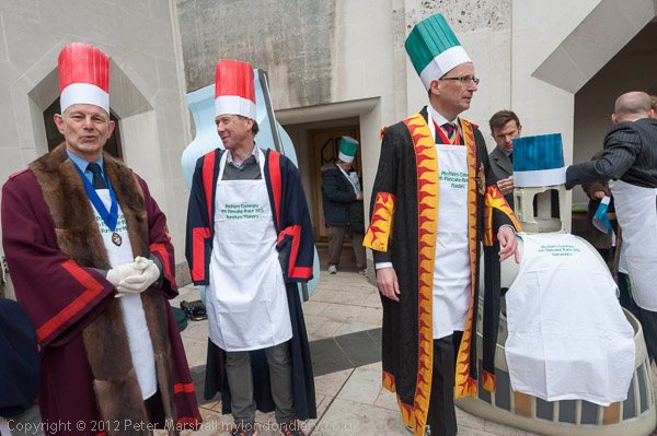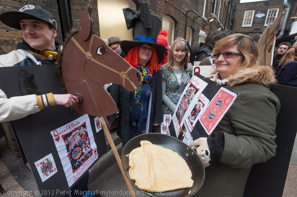 Among the guilds contributing expertise to the event are the Gunmakers who provide a small but very loud cannon to start each heat, Clockmakers who attend to the timing, Fruiterers who provide lemons, Cutlers plastic forks, Glovers white gloves to be worn by each runner, and the Poulters whose eggs are used to make the pancakes.