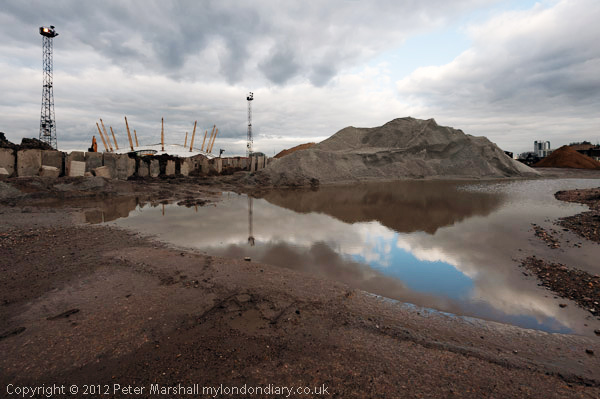 At first the walk goes alongside a giant manmade landscape of sand and gravel, like some alien planet - and behind the conical hills the Dome and the gas holder, with occasional lighting towers and cranes add to the scene. Most of this is behind tall fences, but fortunately these have gaps between the posts allowing you to see and photograph. Years ago the path here went through a working container dock, the Victoria Deep Water Terminal, with yellow lines marking the route, though occasionally it was blocked by crane operations, and we waited rather than have heavy containers overhead. There are a couple of my pictures of this and others from the riverside path in the 1980s on my London's Industrial Heritage site.