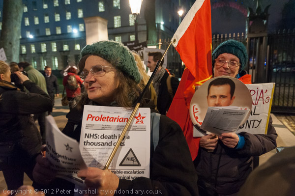 But Stop the War have failed to convince the public at large with their more recent campaigns against intervention in Libya and now against the support being given to the Free Syrians and the Mali government. Even among many left groups opinions are split, with many calling for an end to the Assad regime. Certainly few would want to show support for Assad or carry placards with his face on them, as a couple of people from a small left group, the Communist Party of Great Britain (Marxist-Leninist) did at this event. Many others feel Assad should go, but the important thing is what kind of regime should replace him.