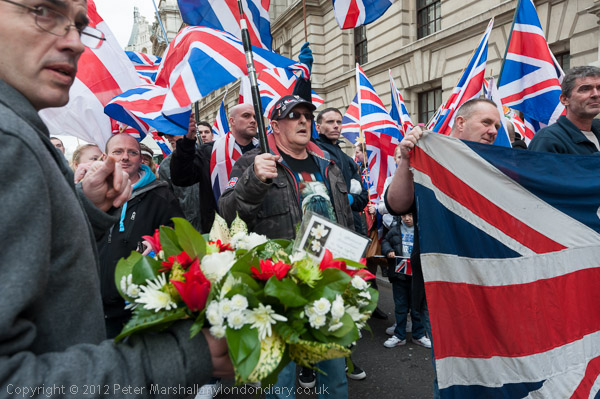 I found the group of around a hundred protesters outside a pub on Whitehall and went with them when they formed up for the march in Whitehall Place. Almost all of them were carrying Union flags, though there were a few Ulster and Orange flags also on show.