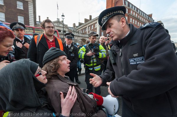 Although in general the protest was a organised peaceful and orderly one, I heard later from a photographer who had been attacked by a group of the marchers when one of them objected to being photographed. Several other photographers took pictures and came to his assistance. I was photographing the head of the march and didn't see this, but was there when the same group returned and again briefly threatened photograpahers and people taking part in another protest on Whitehall an hour or so later. Police who were following them quickly intervened and moved them on.