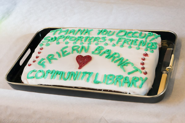 The cake says 'Thank you Occupy Supporters + Friends - Friern Barnet Community Library'