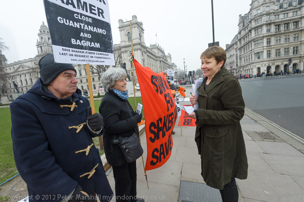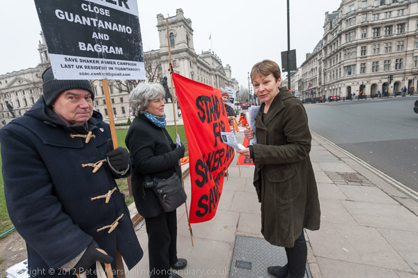 Green MP Caroline Lucas comes over to talk to the protesters and give her support