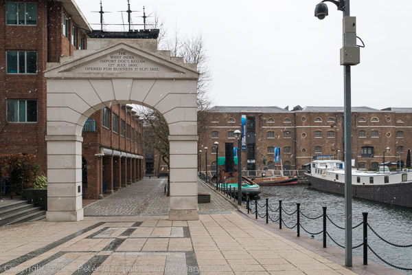The old gateway to the West India Import Dock - and the Museum of London in Docklands to its right