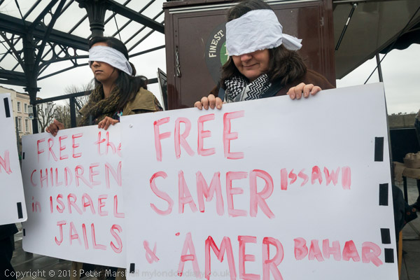 Human rights protesters from Camden with blindfolds and placards calling for the release of Palestinian