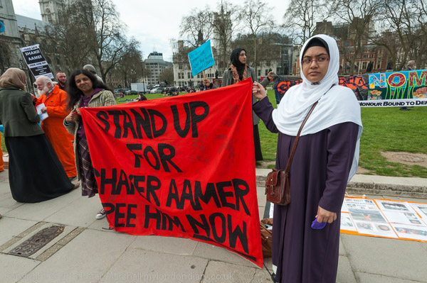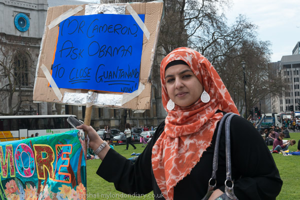 'Please Free Our Brother Shaker Aamer' - and on her back it read 'Shame on Obama for Lying'