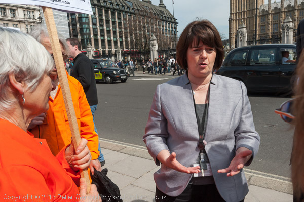 Battersea MP Jane Ellison comes to talk to the protesters about the debate in Parliament and to give her support