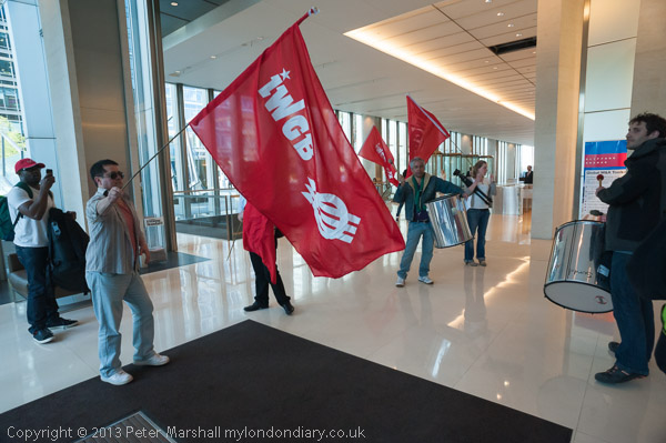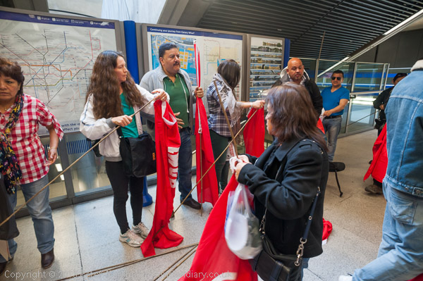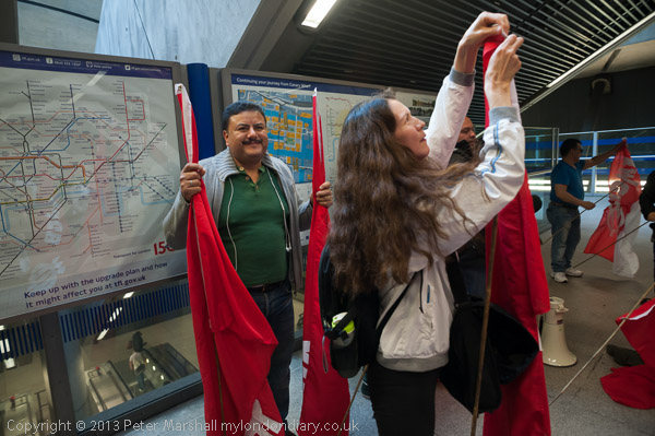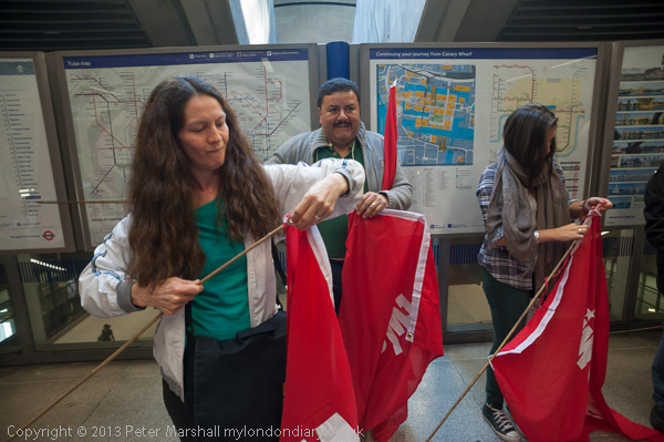 At Canary Wharf station they get the IWGB flags ready for the protest