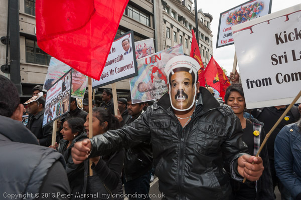 Many protesters wore masks showing the face of Sri Lankan President Mahinda Rajapakshe with fangs and horns