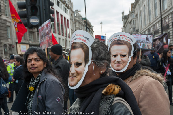 David Cameron masks say 'I don't mind shaking hands with the war criminals'