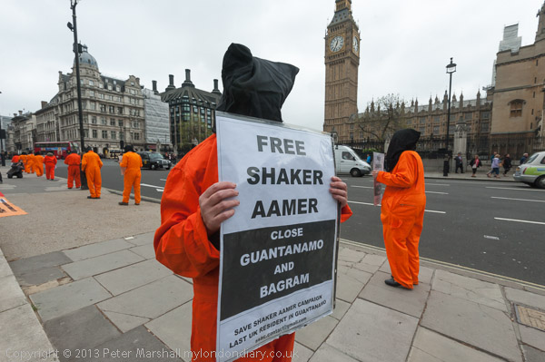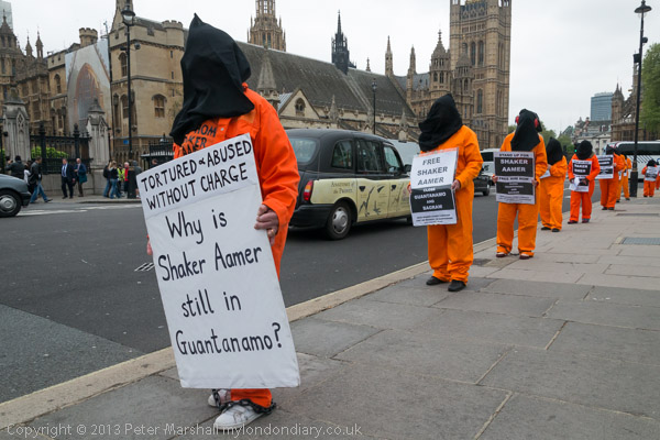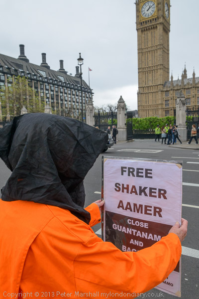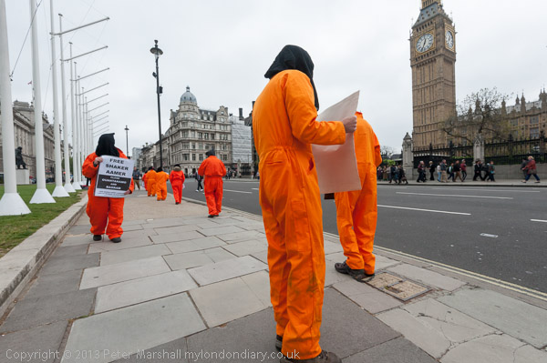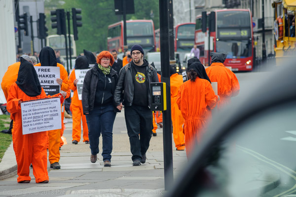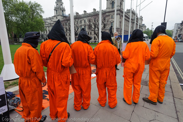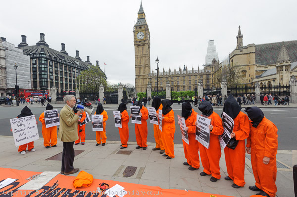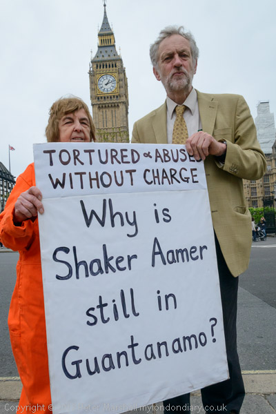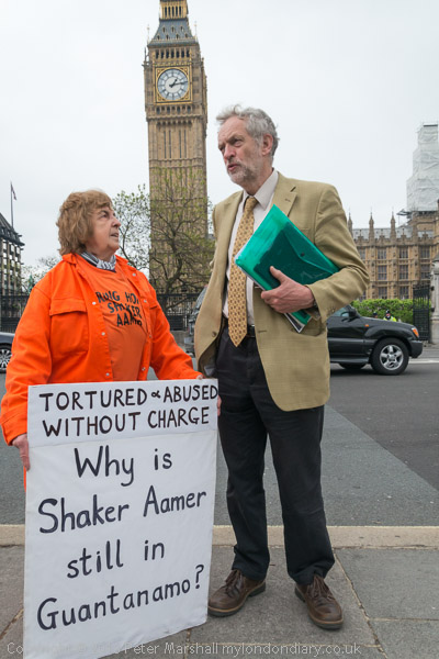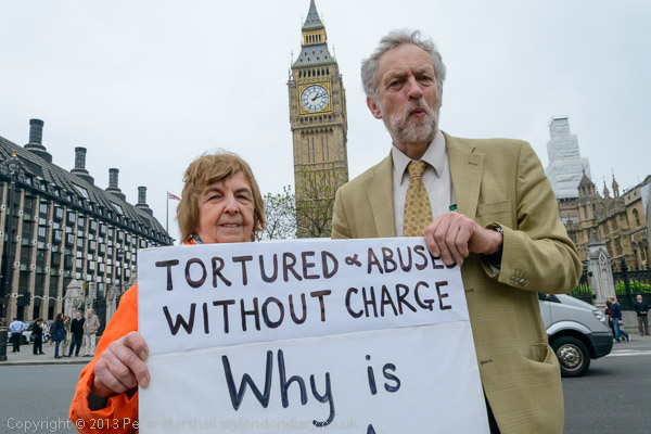 Jeremy Corbyn MP speaking to protesters in their orange jump-suits and black hoods in front of Parliament