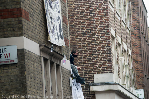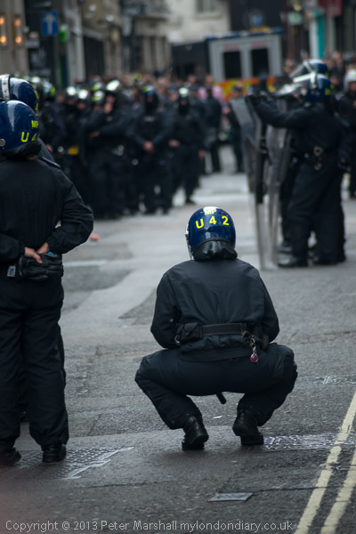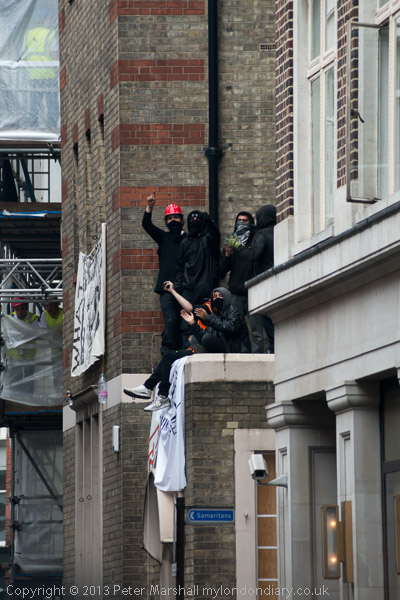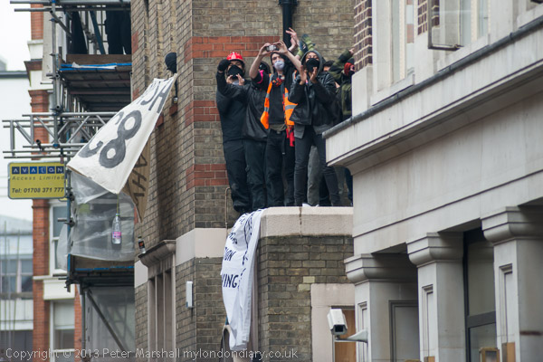 The police with riot shields were opposite the front of the building. Inside were a fairly small number of peaceful protesters, including some children