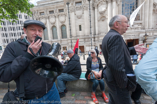 ![]() 'Left Unity sponsored by Talk Talk. Come on do it Brazilian Style on the streets' ![]() ![]() Nick Heath ![]() and Ian Bone ![]() ![]() shake hands ![]() Ian Bone speaks. One person on the street below is listening ![]() |