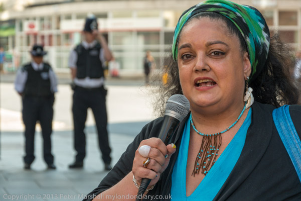 The event started with a rally outside the US embassy, led by Zita Holbourne and Lee Jasper, founders and national co-chairs of anti-austerity, anti-racist campaigning organisation Black Activists Rising Against Cuts (BARAC) UK, with contributions from other activists and poets including Holbourne who is also a National Executive member of the PCS Union.