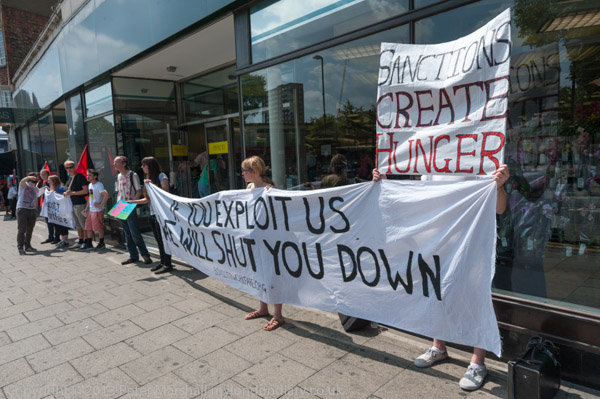 The central London action by around a hundred activists was one of those in 13 cities around the country targeting HSBC branches from Glasgow to Exeter. In Brixton, they managed to set up their protest food bank inside the branch, but those in central London were closed down by the HSBC and the doors locked before the protesters arrived.