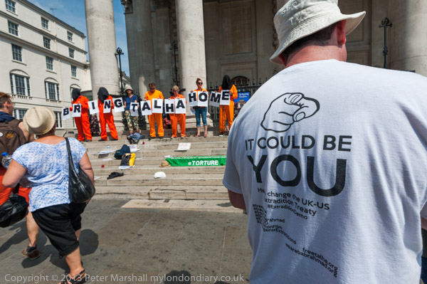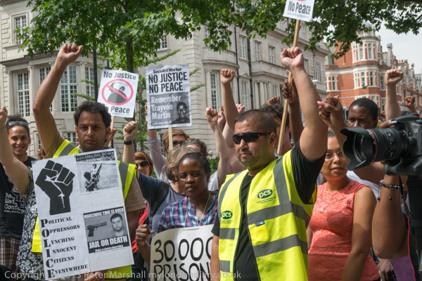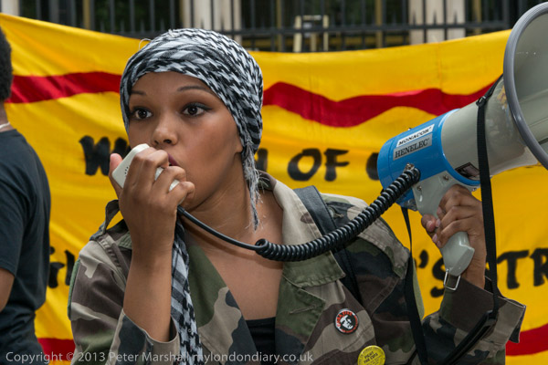 The event started at the US Embassy because of the killing in Florida of Trayvon Martin and the global outcry against the acquittal of his murderer under the Florida 'Stand Your Ground' law. There were loud boos at the news that George Zimmerman has been offered a large sum to write his story.