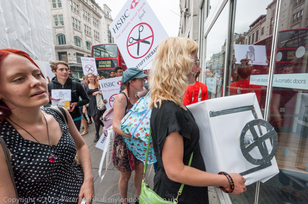 UK Uncut protesters against tax dodging by HSBC and its customers and the huge payouts to banks whose greed and lies were central to the econnomic collapse closed 2 HSBC branches in the West End, setting up symbolic food banks outside them.