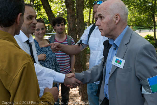 Grattan Puxon puts a Romam flag armband on one of the others taking part