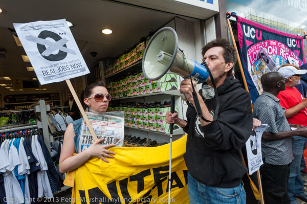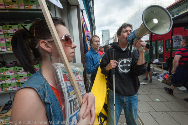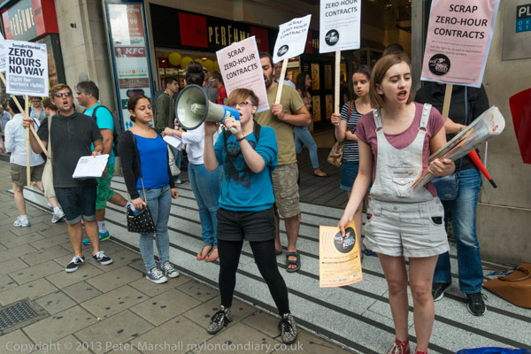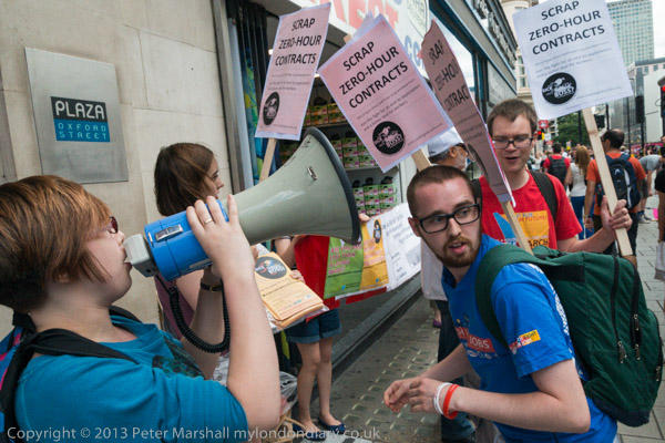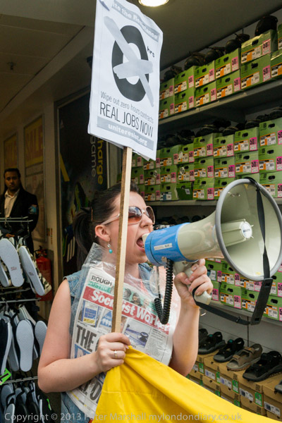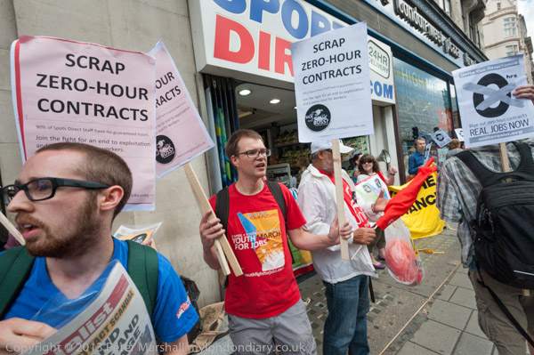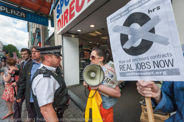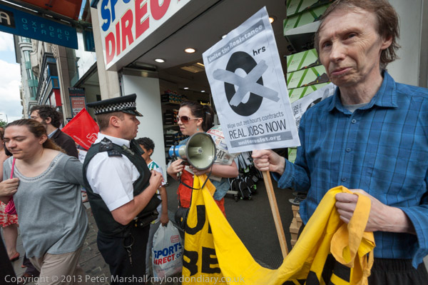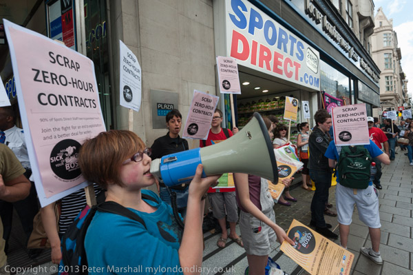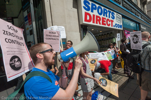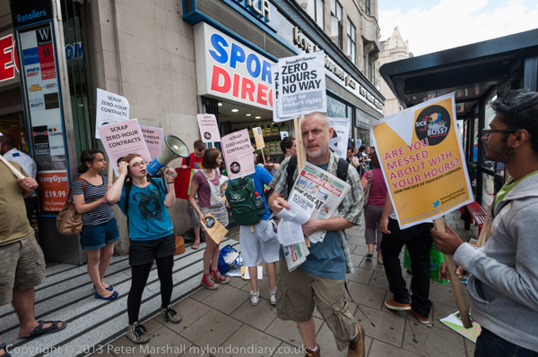 Protesters lined the pavement outside Sports Direct in the Plaza shopping centre on Oxford St