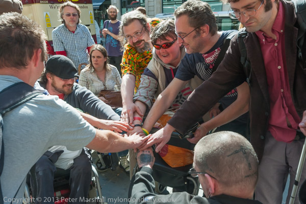 Outside they joined hands before setting out on the protest