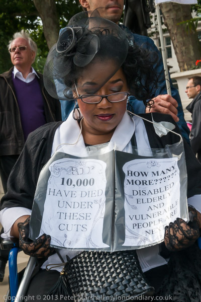 A woman dressed in black with a hat and veil             Winvisible campaigners with a list of several who died after having benefits cut
