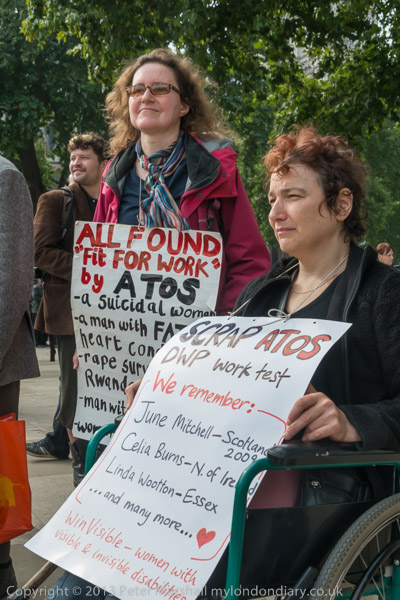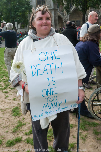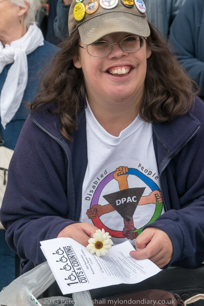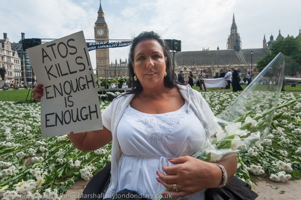 A woman in white with white lilies and a poster 'Atos Kills! Enough is Enough'